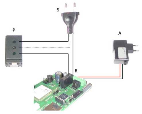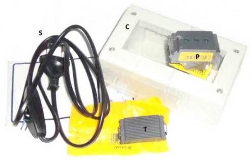 Le scatole ed il resto del materiale elettrico, sono disponibili presso i negozi di elettricità, i grandi centri brico (Castorama, Leroy Merlin...) offrono un'ampia scelta di modelli, sia per interno che per esterno (a tenuta stagna). Un kit è dunque costituito dal materiale seguente: il contenitore (C), una o più (secondo quanti dispositivi si vuole controllare a distanza) prese di corrente (P), uno o più tappa-buchi (T), un filo con spina da collegare alla rete elettrica (S), un alimentatore 12Vcc (A) e ovviamente il relè/telecontrollo gsm (R). Una volta inserite le prese (P) ed i tappa-buchi (T) nel contenitore (C), il materiale va collegato come indicato dallo schema nella figura centrale: una delle fasi della tensione di rete 220Vac, prelevata dalla spina (S), viene interrotta e fatta passare nel relè telecontrollato (R) che fa da interruttore, per poi ricollegarsi alla presa (P); l'altra fase ed il collegamento di terra, se presente, sono diretti dalla spina (S) alla presa (P). Dopo aver terminato le connessioni, la realizzazione può essere collaudata dando alimentazione alla parte elettronica, con l'alimentatore 12Vcc (A), ed inviando alcuni sms per verificare accensioni e spegnimenti dell'apparecchiatura pilotata via sms, che va collegata alla presa (P). Inserito il telecontrollo con relè nella scatola, il risultato finale della presa di corrente comandata via sms, chiusa e pronta all'uso è quello della foto in basso. Un'ultima raccomandazione: prestare attenzione alle potenze!!! Ci sono prese (P) che arrivano a 10A (circa 2000watt), altre (come le prese circolari shuko) arrivano a 16A (3200watt), scegliere quella più adeguata in base all'assorbimento dell'apparecchio da utilizzare e magari prevedere un fusibile in serie alla fase che passa nel relè. Anche i relè hanno una portata che può andare da 3A sino a 10A, scegliere perciò il modello più indicato. In fine, la sezione dei cavi elettrici sia della spina (S) che dei fili di connessione interni deve essere di sezione adeguatamente robusta al carico elettrico da sopportare; nel dubbio, meglio esagerare in eccesso. Buon lavoro :-)