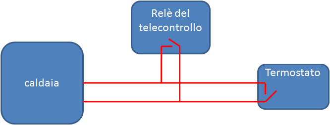 Tra le possibili tipologie di accensioni e spegnimenti che possono essere effettuate a distanza, il controllo della caldaia dei riscaldamenti è una delle applicazioni più utili e richieste. In questo caso, il telecontrollo non viene utilizzato per dare o togliere corrente alla caldaia (come si potrebbe fare con un termosifone o una stufa elettrica) ma per interrompere o ripristinare il funzionamento del termostato. Facciamo un passo indietro per spiegare il significato dell'ultima frase. Un impianto di riscaldamento è costituito da un elemento bruciatore (la caldaia) ed un elemento di controllo (il termostato) che viene impostato alla temperatura desiderata e controlla l'attivazione e la disattivazione della caldaia. Quando la temperatura raggiunge il valore desiderato, il termostato comanda l'arresto della caldaia; quando la temperatura scende sotto al valore impostato, il termostato dà alla caldaia il consenso per riprendere a riscaldare. Insomma, nella sua concezione più semplice, il termostato è un interruttore termico; non a caso, prima dell'avvento dell'elettronica, era costituito da una spirale di metallo che, dilatandosi e restringendosi con l'aumentare ed il diminuire della temperatura, andava ad interrompere e ripristinare un contatto elettrico (proprio come un interruttore). Oggi l'elettronica ha fatto notevoli passi in avanti ed i termostati possono essere anche costituiti da sensori che comunicano con la caldaia secondo un protocollo proprietario. Ad ogni modo il principio d'uso del telecontrollo è lo stesso, consentire o meno al termostato di dare il consenso alla caldaia per bruciare. Per attuare questo scopo occorre: impostare il termostato della caldaia alla temperatura desiderata, interrompere uno dei due fili che dal termostato vanno alla caldaia, collegare i due capi del filo interrotto ai contatti di un relè del telecontrollo (come da figura superiore sottostante). Inviando un sms di comando "ON" al telecontrollo e chiudendo il relè, verrà ripristinato il collegamento tra termostato e caldaia ed il termostato comanderà alla caldaia di raggiungere la temperatura preimpostata. Nel telecontrollo embedded, dotato di sensore di temperatura integrato, è anche possibile programmare via sms la temperatura desiderata; in questo caso il termostato va preimpostato ad una temperatura alta e sarà il telecontrollo a regolare la temperatura al valore impostato a distanza. Il collegamento del relè del telecontollo in serie al termostato, ha un duplice vantaggio: è un collegamento che non fa danni e che prescinde dalla tipologia di termostato, dunque particolarmente utile nel caso in cui il termostato non sia un semplice interruttore standard ma sia ad esempio un sensore che dialoga con la caldaia. Se il termostato è invece un semplice interruttore, per alcune modalità d'uso è possibile utilizzare la configurazione in parallelo (figura inferiore, in basso), ossia la caldaia può essere azionata indifferentemente sia mediante il telecontrollo che tramite il termostato. In questo caso ad esempio, il termostato può essere impostato ad una temperatura di pochi gradi (attuando la funzione anti-gelo) ed il telecontrollo può essere utilizzato per riscaldare la seconda casa prima di andarvi a trascorrere il week-end.