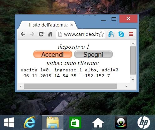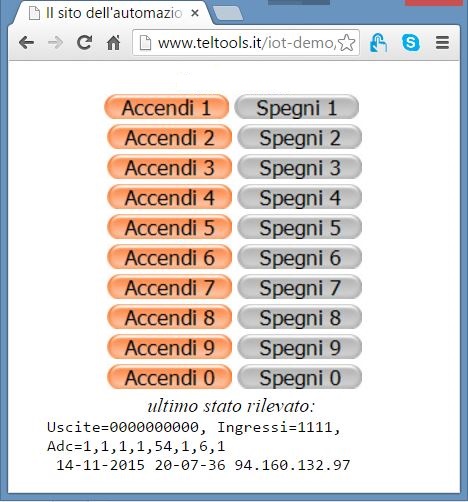Le foto, mostrano un caso reale in funzione, con i "bottoni" di comando accendi/spegni, la descrizione dello stato delle uscite e degli ingressi, ed alcuni dati aggiuntivi (ad es. la data dell'ultimo aggiornamento). E'una schematizzazione del principio di funzionamento: i tasti possono essere personalizzati con un testo differente (apri/chiudi, attiva/disattiva...), gli stati degli ingressi possono essere resi più espliciti (motore avviato, saracinesca aperta, cancello chiuso, temperatura 27gradi...), una foto dell'impianto oppure il logo aziendale possono essere aggiunti a completamento dell'interfaccia. Queste personalizzazioni estetiche sono una parte del servizio che costituisce la soluzione IoT-service; l'altra componente è costituita dal supporto di una applicazione che risiede su un sito internet. I costi dipendono dalla quantità e dalla complessità delle modifiche desiderate e dal tipo di servizio web richiesto.