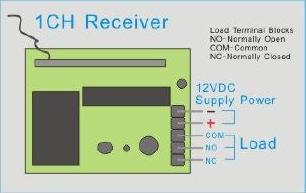 La piedinatura del pin-strip a 5 poli posto sulla sezione radio-relč č la seguente (da sx verso dx): massa, alimentazione 12Vcc, contatto comune, contatto normalmente aperto (n.o.) e contatto normalmente chiuso (n.c.). I contatti relč supportano 3A 24Vdc max / 3A 120Vac.