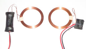 Kit costituito da un trasmettitore (foto dx) con alimentazione sino a 12Vcc ed un ricevitore (foto sx) con uscita 5Vcc - 600mA max. I due dispositivi, separati alla distanza max di 20mm, sono accoppiati in modo induttivo ossia il trasmettitore riesce a trasferire una potenza elettrica al ricevitore senza contatto fisico; il kit consente di realizzare ad es. sistemi di alimentazione o carica-batterie wireless. Il ricevitore può essere posto in un contenitore, indumento, borsa... utilizzando il trasmettitore per alimentarlo dall'esterno. | ||