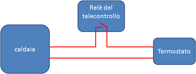 Tra le possibili tipologie di accensioni e spegnimenti che possono essere effettuate a distanza, il controllo della caldaia dei riscaldamenti è una delle applicazioni più utili e richieste. In questo caso, il telecontrollo non viene utilizzato per dare o togliere corrente alla caldaia (come si potrebbe fare con un termosifone o una stufa elettrica) ma per interrompere o ripristinare il funzionamento del termostato. Facciamo un passo indietro per spiegare il significato dell'ultima frase. Un impianto di riscaldamento è costituito da un elemento bruciatore (la caldaia) ed un elemento di controllo (il termostato) che viene impostato alla temperatura desiderata e controlla l'attivazione e la disattivazione della caldaia. Quando la temperatura raggiunge il valore desiderato, il termostato comanda l'arresto della caldaia; quando la temperatura scende sotto al valore impostato, il termostato dà alla caldaia il consenso per riprendere a riscaldare. Insomma, nella sua concezione più semplice, il termostato è un interruttore termico; non a caso, prima dell'avvento dell'elettronica, era costituito da una spirale di metallo che, dilatandosi e restringendosi con l'aumentare ed il diminuire della temperatura, andava ad interrompere e ripristinare un contatto elettrico (proprio come un interruttore). Oggi l'elettronica ha fatto notevoli passi in avanti ed i termostati possono essere anche costituiti da sensori che comunicano con la caldaia secondo un protocollo proprietario. Ad ogni modo il principio d'uso del telecontrollo è lo stesso, consentire o meno al termostato di dare il consenso alla caldaia per bruciare. Per attuare questo scopo occorre: impostare il termostato della caldaia alla temperatura desiderata, interrompere uno dei due fili che dal termostato vanno alla caldaia, collegare i due capi del filo interrotto ai contatti di un relè del telecontrollo (come da figura superiore sottostante). Inviando un sms di comando "ON" al telecontrollo e chiudendo il relè, verrà ripristinato il collegamento tra termostato e caldaia ed il termostato comanderà alla caldaia di raggiungere la temperatura preimpostata. Nel telecontrollo embedded, dotato di sensore di temperatura integrato, è anche possibile programmare via sms la temperatura desiderata; in questo caso il termostato va preimpostato ad una temperatura alta e sarà il telecontrollo a regolare la temperatura al valore impostato a distanza. Il collegamento del relè del telecontollo in serie al termostato, ha un duplice vantaggio: è un collegamento che non fa danni e che prescinde dalla tipologia di termostato, dunque particolarmente utile nel caso in cui il termostato non sia un semplice interruttore standard ma sia ad esempio un sensore che dialoga con la caldaia. Se il termostato è invece un semplice interruttore, per alcune modalità d'uso è possibile utilizzare la configurazione in parallelo (figura inferiore, in basso), ossia la caldaia può essere azionata indifferentemente sia mediante il telecontrollo che tramite il termostato. In questo caso ad esempio, il termostato può essere impostato ad una temperatura di pochi gradi (attuando la funzione anti-gelo) ed il telecontrollo può essere utilizzato per riscaldare la seconda casa prima di andarvi a trascorrere il week-end.